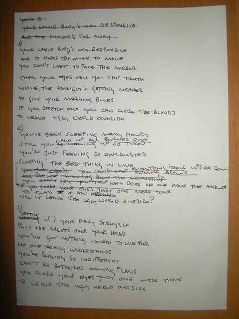 The chorus for this was written in October 2011 when during Skype sessions the moments of my fiancée being completely burned out on everything happened more and more often. Her body often didn't work with her, having a very sore back or waking up with a headache and this resulting in her not wanting to do anything. Add the constant bitching of her mom to this and you'll end up feeling like wanting to sleep all the time. She also stopped talking to me, feeling it was all useless, and yet I sat on the other side of the world feeling helpless. She claimed I didn't understand or know what was going on yet it was very obvious when looking at her. I finished and rewrote the song in late June, early July 2012 and recorded this song 2 other times, but none of them felt right. There's a slow one with just me on guitar, there's a rocker which was nearly finished yet I didn't think it was right either, and I felt stuck until one day I walked out of the bathroom singing the first line in a different key, and then thinking "that's it!". And that's the version I recorded and uploaded. I'm very satisfied with the end result, it describes the feeling of me seeing her like that quite well. No energy, completely drained and just burned out on all the drama in her life, yet failing to get a grip on things. |